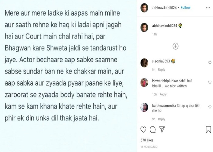 श्वेता कीइस हालत पर उनसेअलग हो चुकेपति और एक्टर अभिनव कोहली ने उनके लिए एक नोट लिखकर सोशल मीडिया पर शेयर कियाहै। इस नोट में अभिनव ने श्वेता की हालत पर तंज कसते हुएउनके जल्द ठीक होने कीकामना की है।